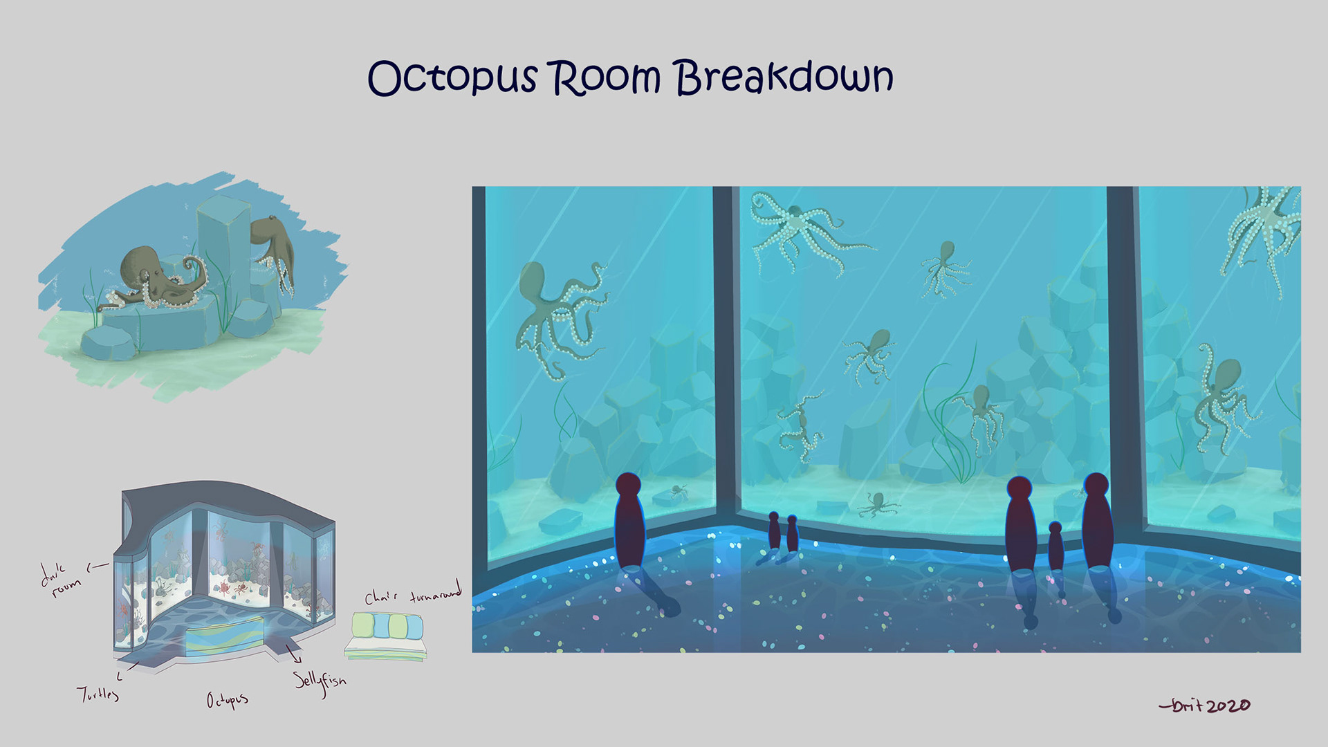 I wanted to focus on lighting on this project. Knowing aquariums tend to be dark with the light coming from the tank, I want to explore how that light would work (not much light from the outside world and all indoors).